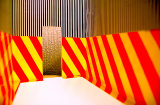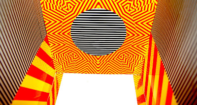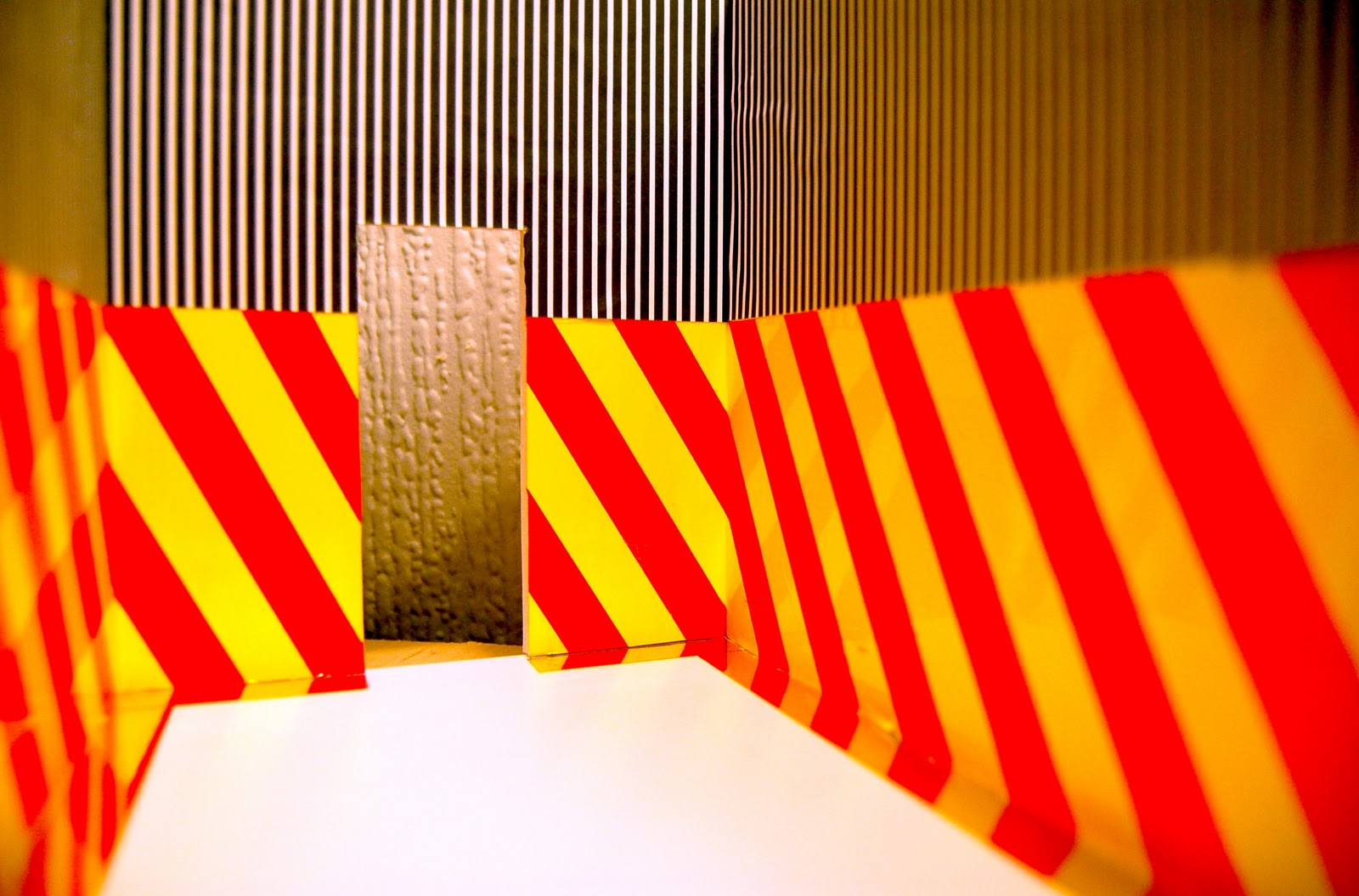 The yellow and orange are flourescent and there is a relfective surface on the floor to extend the perspective of the room