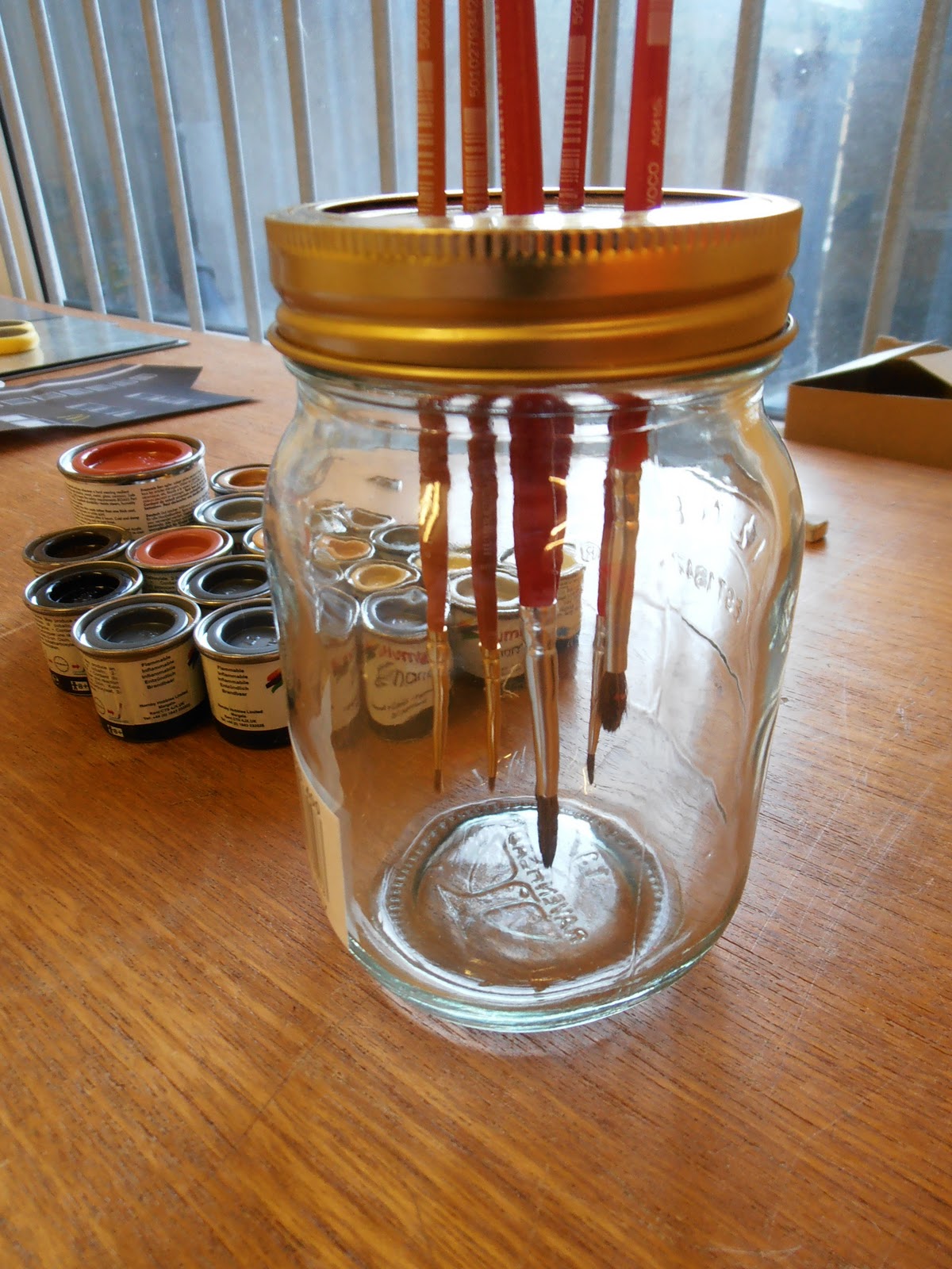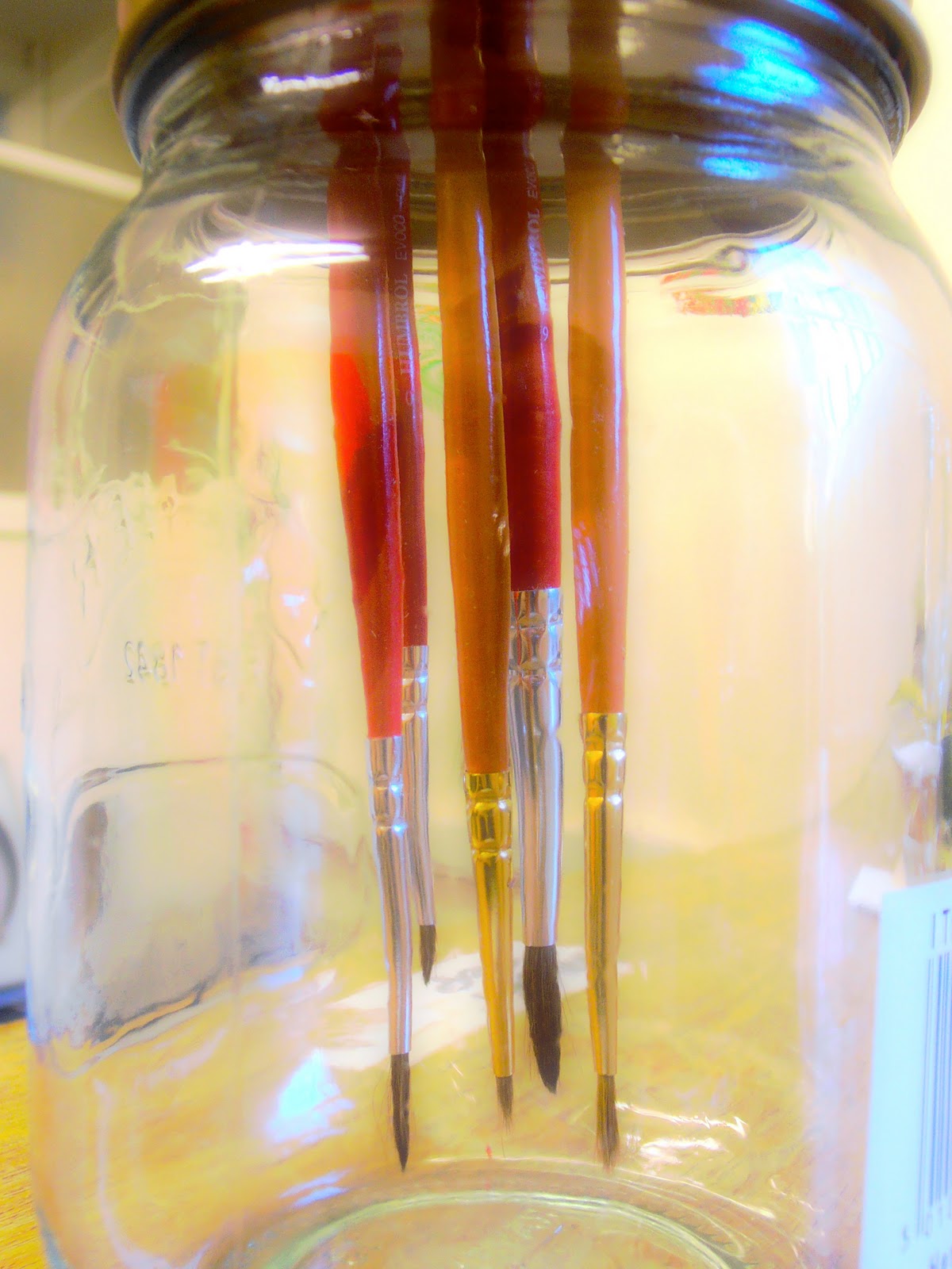So Ive started painting again recently and like my other work it involves detail, which means small brushes. Ive always had the problem of cleaning them and needing to soak them, but the bristles bend if you leave them in. So... Here is my solution. This means I can leave them to soak and they will keep their shape and will not soak up any sediment from the jar.